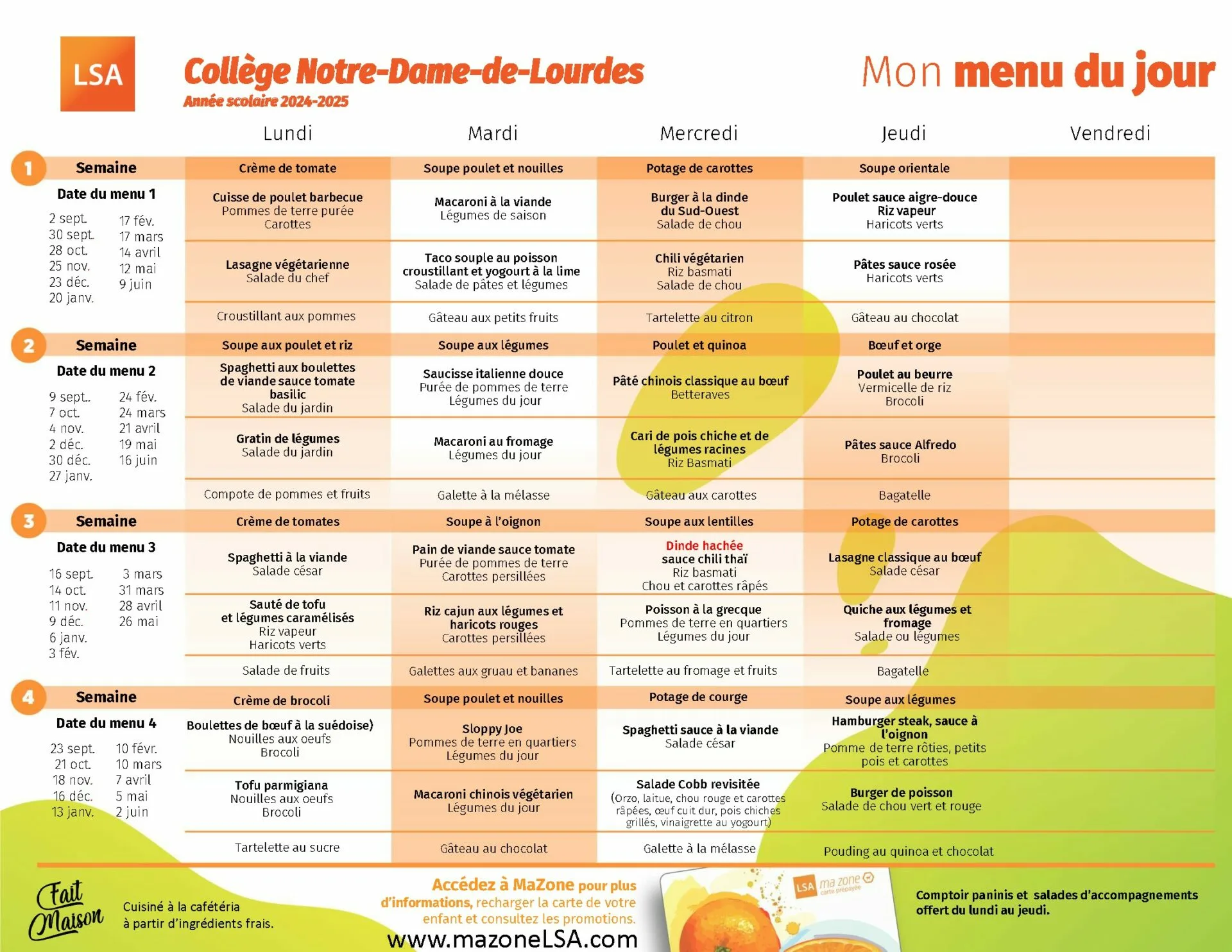 La cafétéria est administrée par : Laberge – services alimentaires inc. et offre aux élèves des menus équilibrés et complets. Un service de carte repas est offert en ligne pour encourager une saine alimentation et favoriser le choix d’un bon repas ou pour compléter la boîte à lunch. Les mets servis répondent aux exigences du gouvernement provincial en matière de qualité des aliments offerts aux élèves.