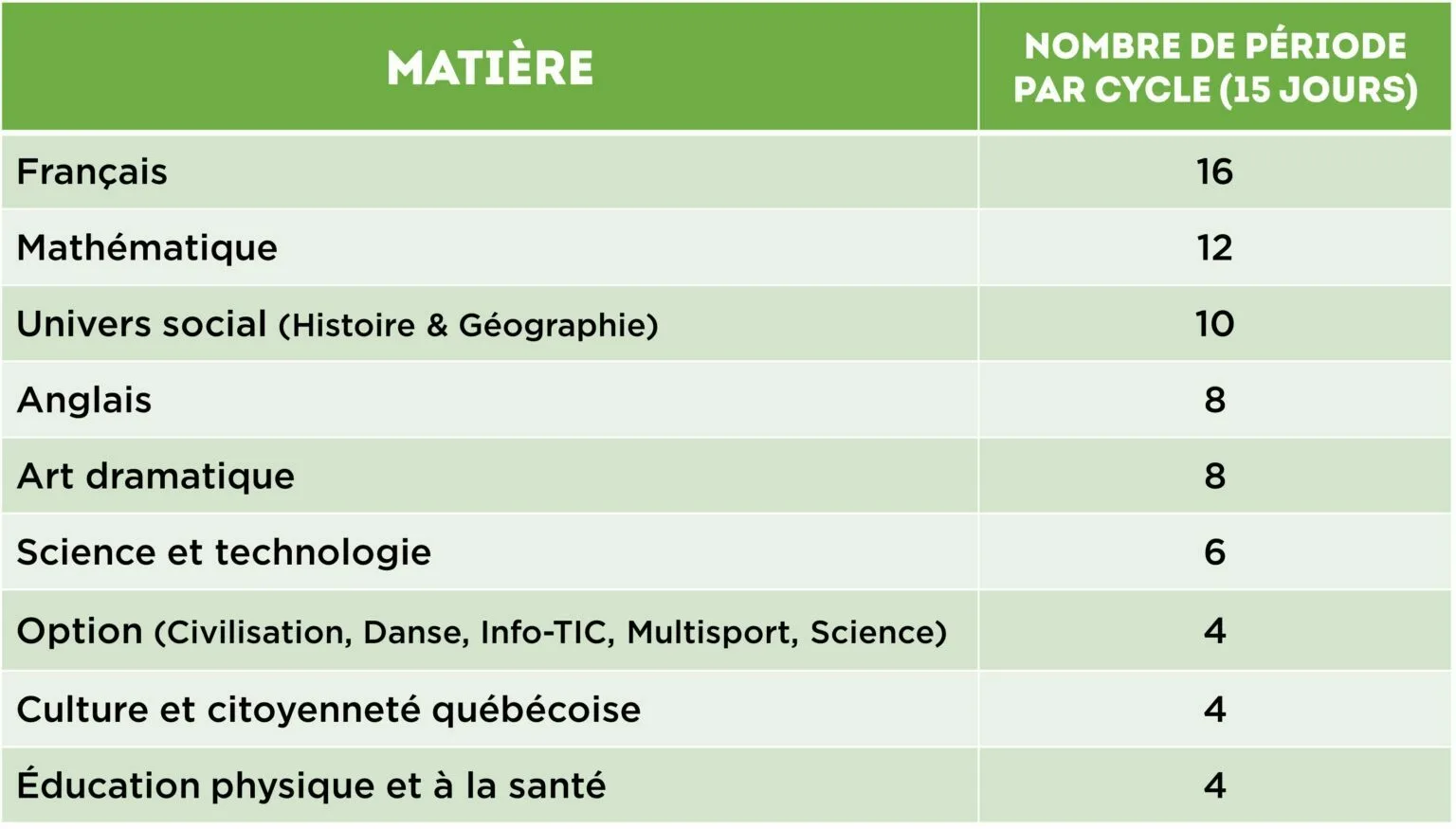 L’horaire des élèves est sur un cycle de 15 jours et le nombre de périodes allouées à chaque matière est réparti selon le mode suivant :